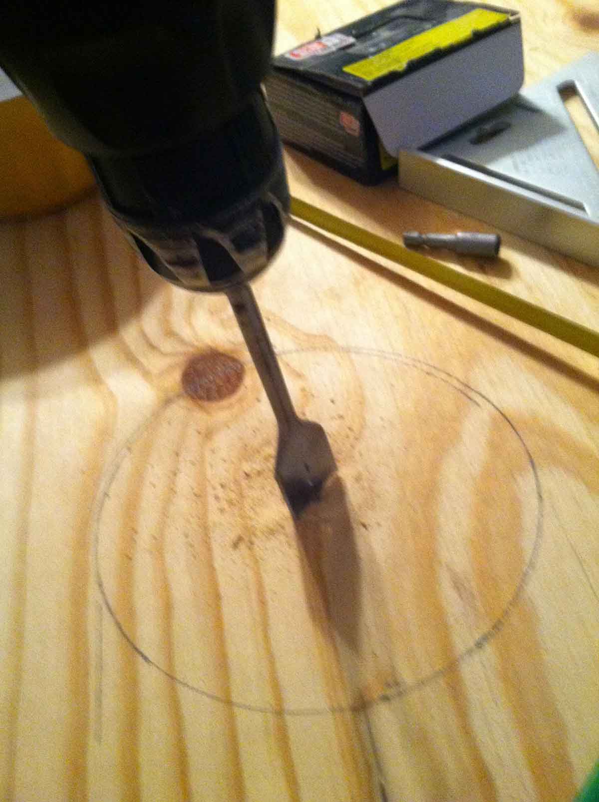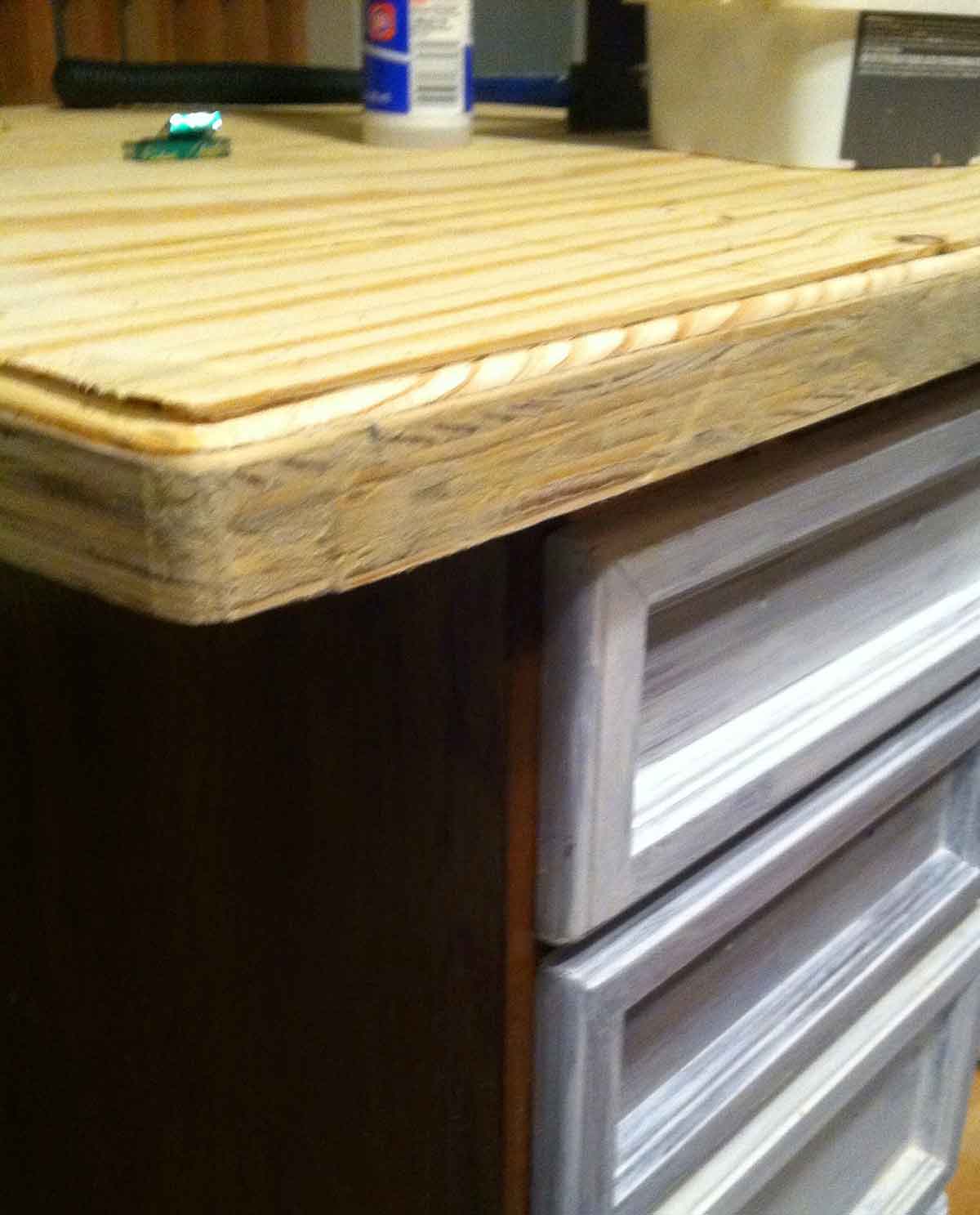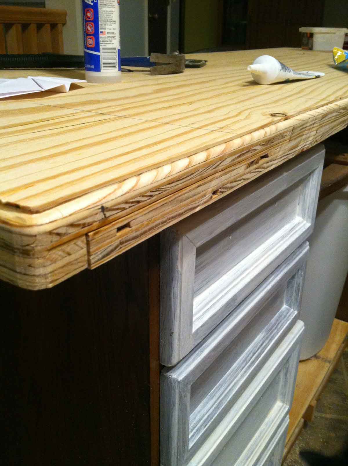 A thick counter looks better than ¾ inch. Get this look by adding an extra 1 ½ inch wide slat to the underside edge of your plywood counter. I did not have clamps, so after wood glue I weighed each slat down with hand weights. It worked.