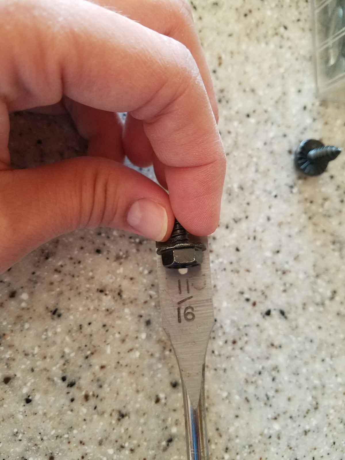 Check the length of your screw against your door by placing it on the side like this. The last thing you want is to ruin the front of your cabinet door. You also want to leave enough length for the thickness of the trash can, about ⅛ th” or more. I used a washer head screw or you can go to your local hardware store and buy just two (that’s the key to keeping it under $5 :).Next, look at your door type.