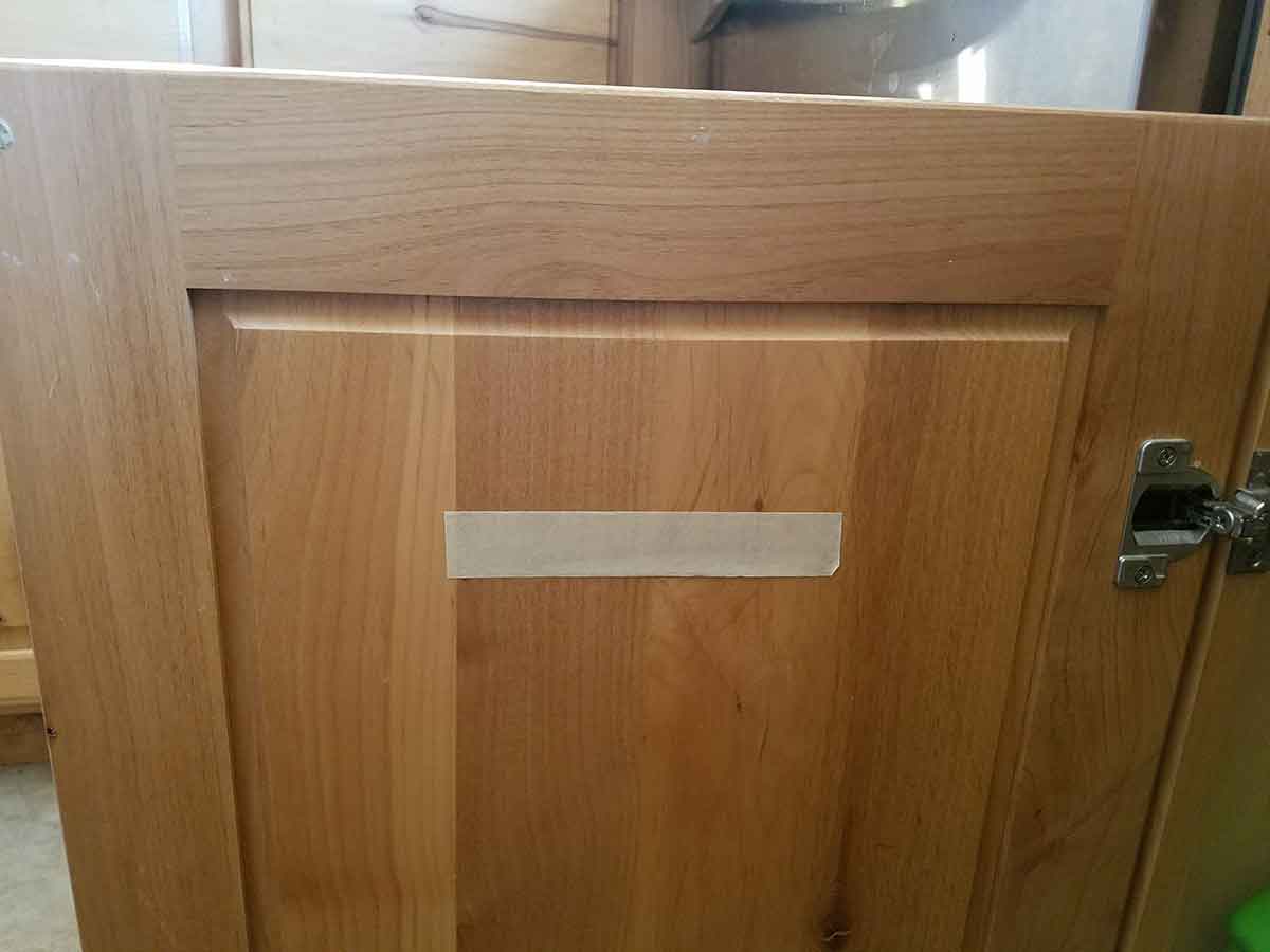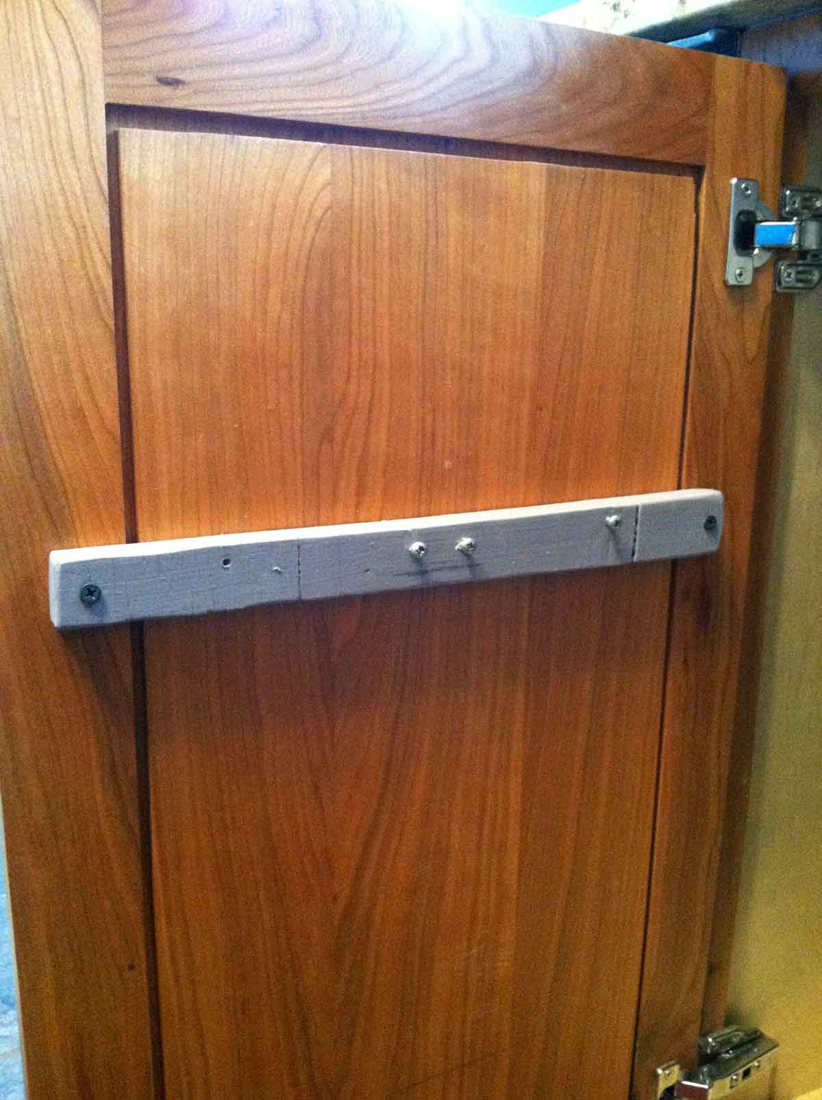 Some doors have a thin ¼” panel on the front and hardwood only along the edges. For this door you will need a support board about 1 ½” wide, ½” thick. Most cabinets have a ½” overlay on the outside of the cabinet–so the board needs to be the length of the door minus 1” on boths sides. screws on either end of the board to attach to the board to your cabinet.