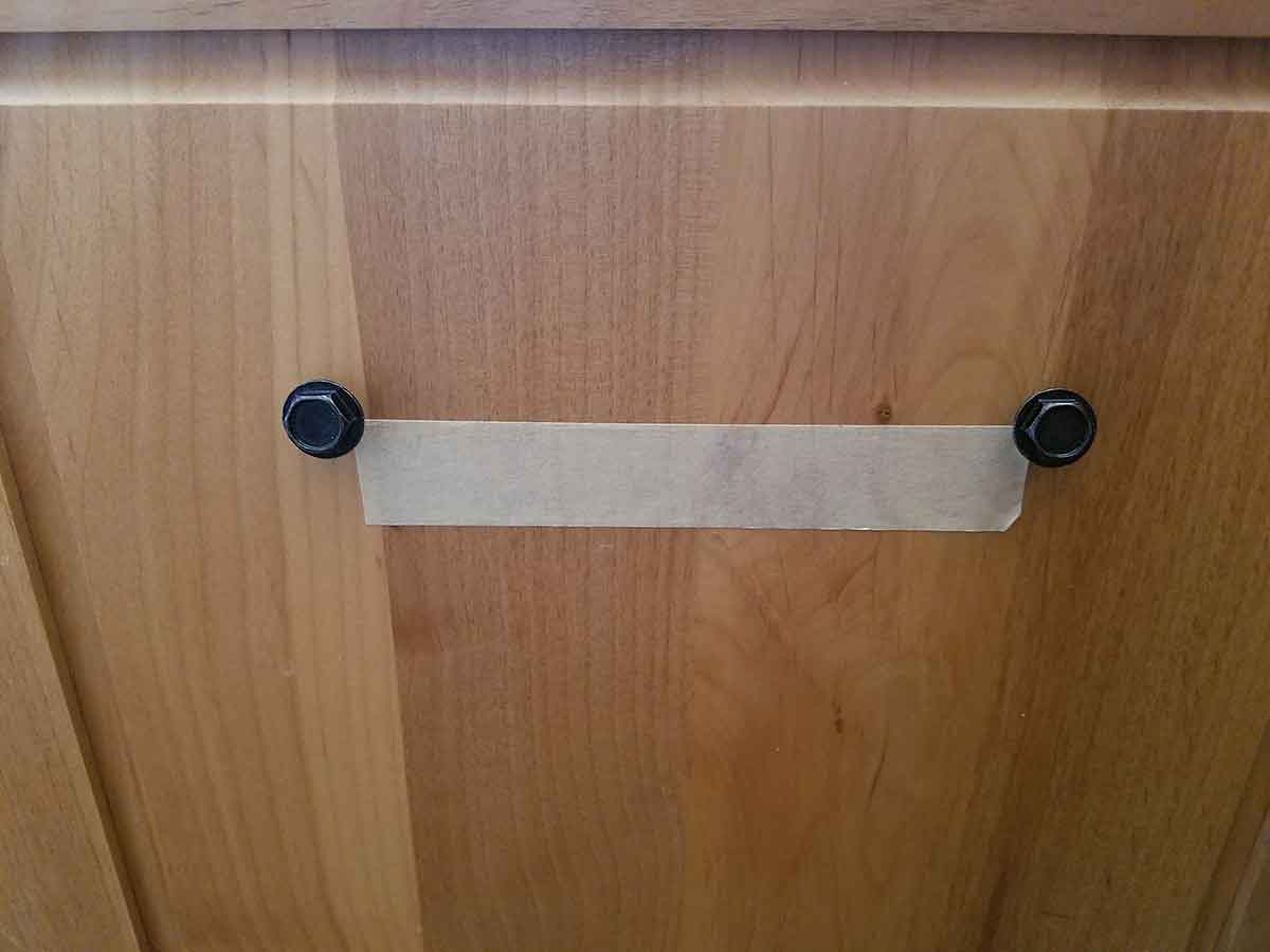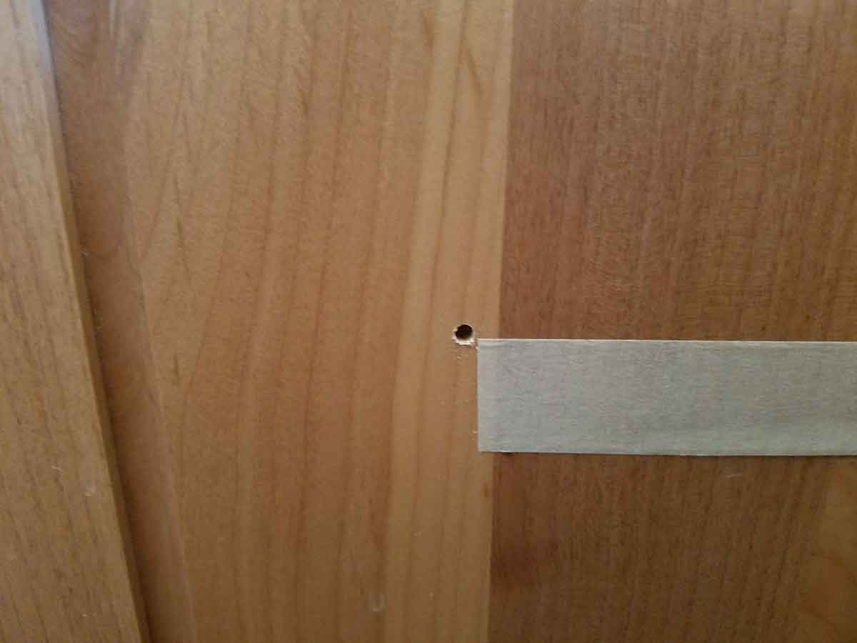 Other doors have solid wood panels so no support wood is needed. Simply measure where you want the holes. I used a piece of tape so I could have the exact distance on the trash can and on the door.