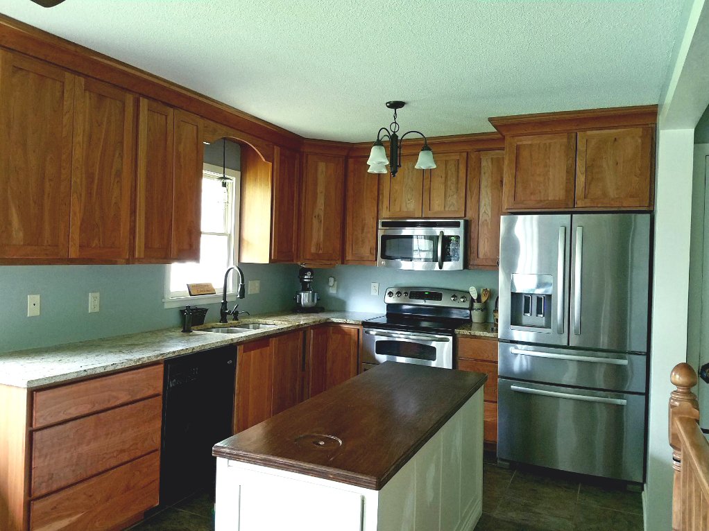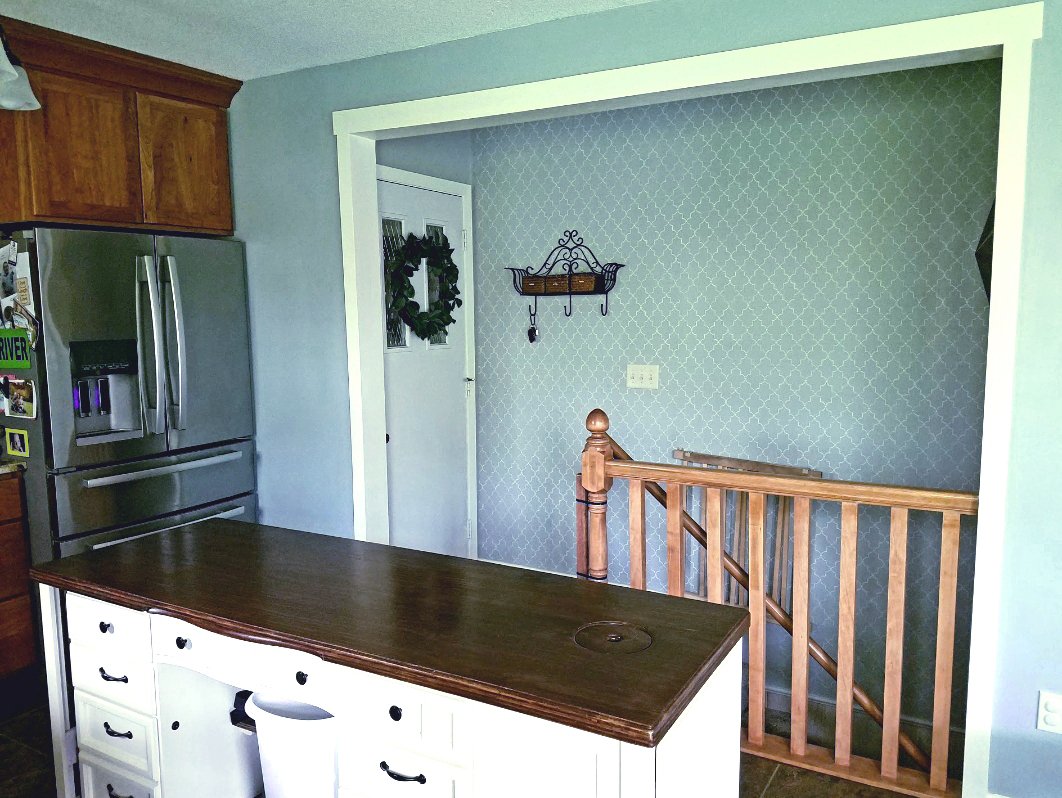 Our home also came with a narrow kitchen surprise, surprise. We were able to knock out a partial wall to open up the kitchen a bit over the stairway, but it still needed help. I decided to add texture to my trouble wall and make it the focal point.