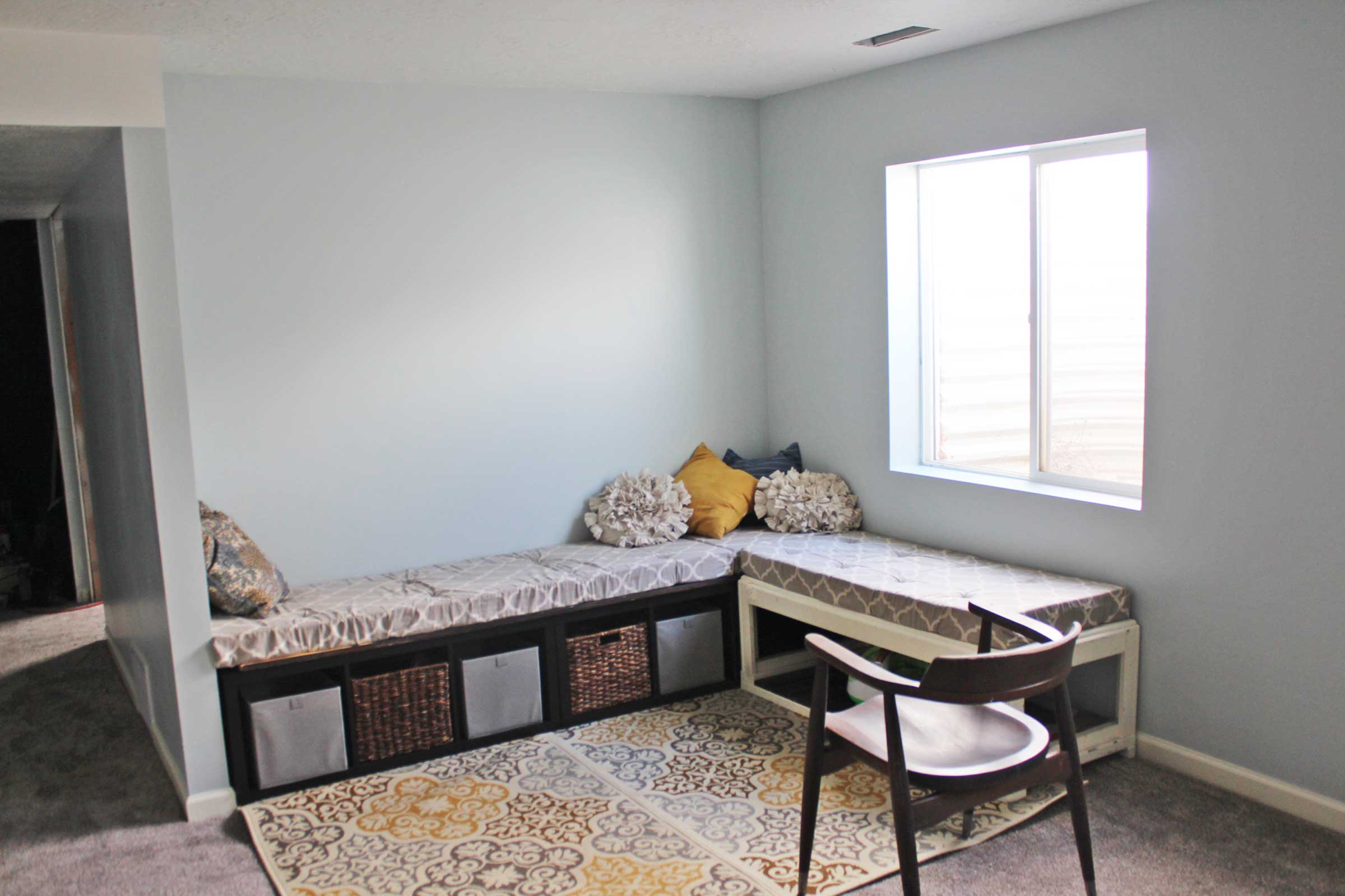 We wanted to create a little nook in our basement where we could just hang out and read a good book. This was a big project because the basement didn’t exist, so it took several additional steps (framing, drywall, etc.) before the building of the bench and staging the area. In the future we’re going to put a zen garden and fairy land in the window well.
