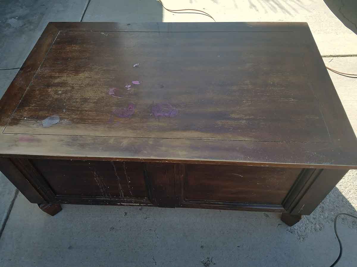 The chest was in rough shape, but it fit the qualifications of internal storage and I loved the wood work on the outside. I thought that with enough washing and sanding I would be able to remove the pink goo.