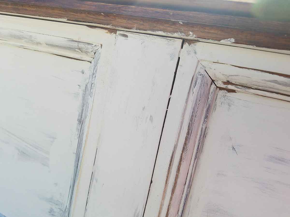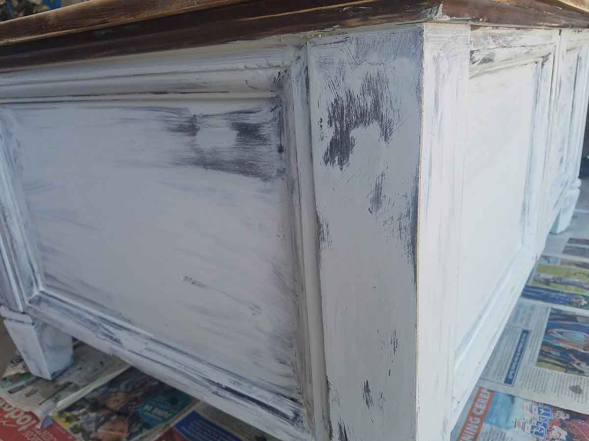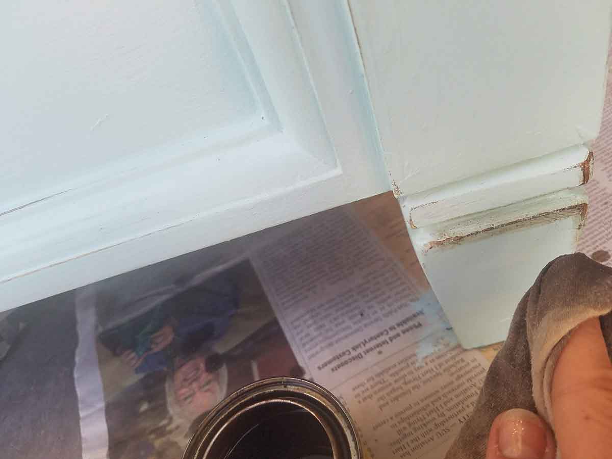 Once the paint was dry, I sanded the edges of the feet and along the wood trim to give a little character. Then I came through with walnut stain and stained the wood so it would stick out a bit. If you ever go too far and don’t like the amount sanded off, simply repaint the section you want unroughed (that’s not a word, but you get the idea).