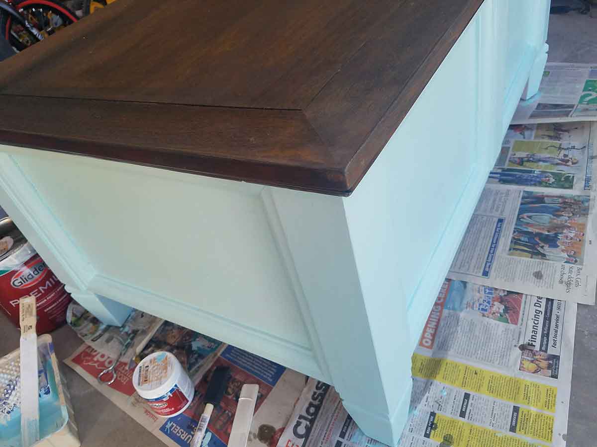 Apply the paint of your choice. I picked Glidden Satin from Home Depot, the original shade was True Turquoise. When painting furniture I like to get the paint samples. One or two sample sizes are often plenty to complete a piece and then I don’t have large amounts of random colors filling my space. I also feel more at ease with branching out to different colors or picking the shade that is just right for each item. This chest took less than one sample can.