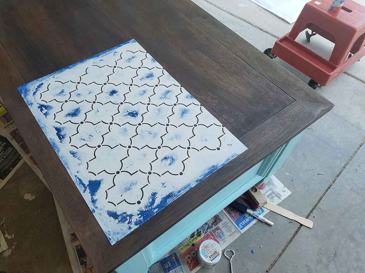To keep the stencil in place while you work, spray with glue adhesive. I highly recommend Elmer’s glue because they are just better. I made the mistake of using the dollar store brand because I had run out of Elmer’s and I spent a long time scraping the horrible glue from the top of the storage chest. Just spray with Elmer’s spray let it dry a minute or two then lay down on the surface.