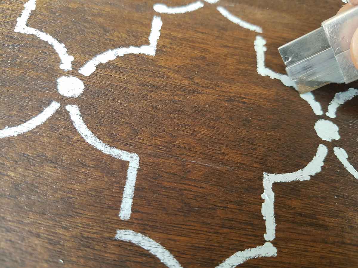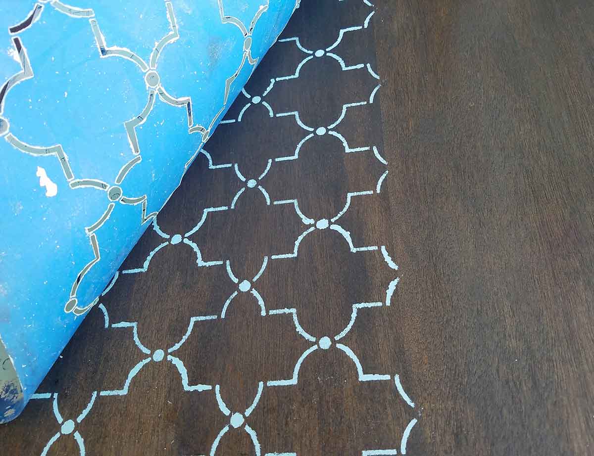 Some sections didn’t fair as well. If you are a perfectionist like I am, a razor blade is an easy way to clean up any edges where the paint came through too thick. When stenciling a wall you can simply touch up with the contrasting wall color, no need to scrape it off.