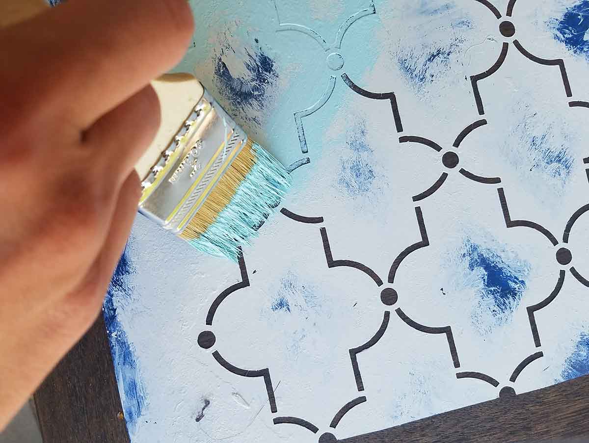 I like to use my trusty cheap brushes, they work really well for many jobs, including stenciling. Now the trick to getting a good stencil look and not many big blobs of paint on the other side is to keep very little paint on your brush at a time. Just enough paint to get the color on. Use a tapping motion and avoid strokes of paint as those pull the paint under the stencil.