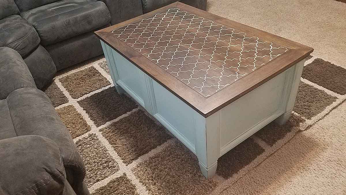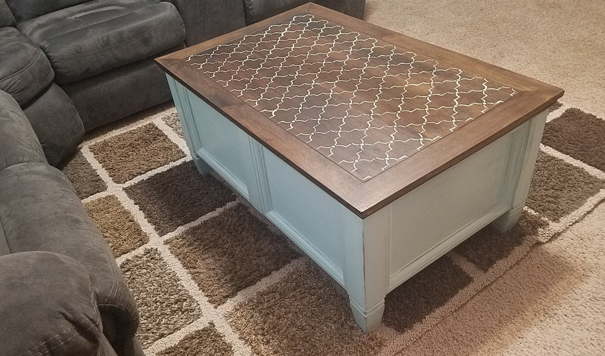 Here is the journey of my storage chest that started out looking like a little girls fingernail polish station, guessing from the princess cards and bubblegum pink puddles on top…I could be wrong. 🙂 The change was exciting, adding a pop of color to this very brown room was just what was needed, I love propping my feet up and admiring the stencil work. In the end, it was my problem, but with a beautiful solution.